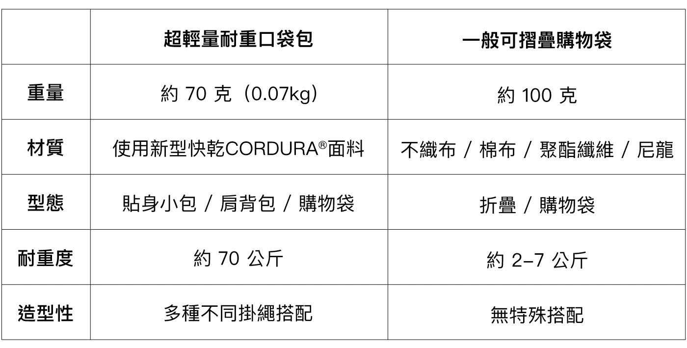 超輕量包袋僅 0.07kg,卻可耐重達 70kg