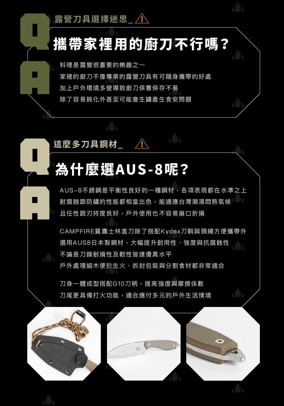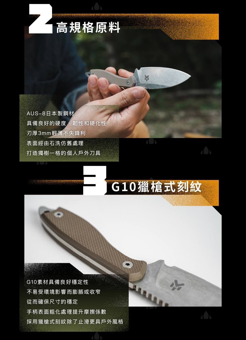 ・材質:日本製造AUS8不鏽鋼、G10手柄、Kydex