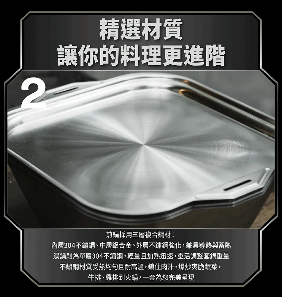 -煎鍋:三層鋼(內層304不鏽鋼、鋁合金導熱層、外層430不鏽鋼)