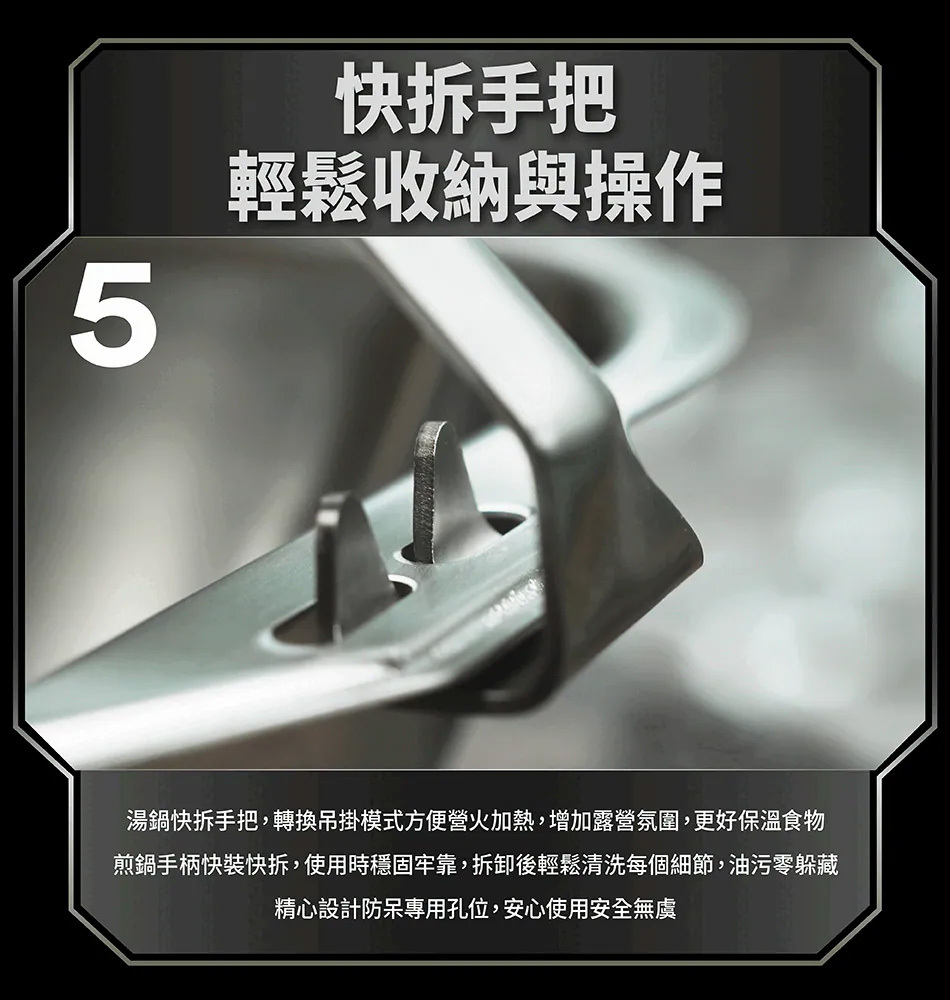 ※湯鍋/煎鍋手把非固定式,僅作為移動用途,烹調時建議將手把完全拆除後再進行加熱料理,也請勿使用甩鍋、大幅提起手把翻炒料理。