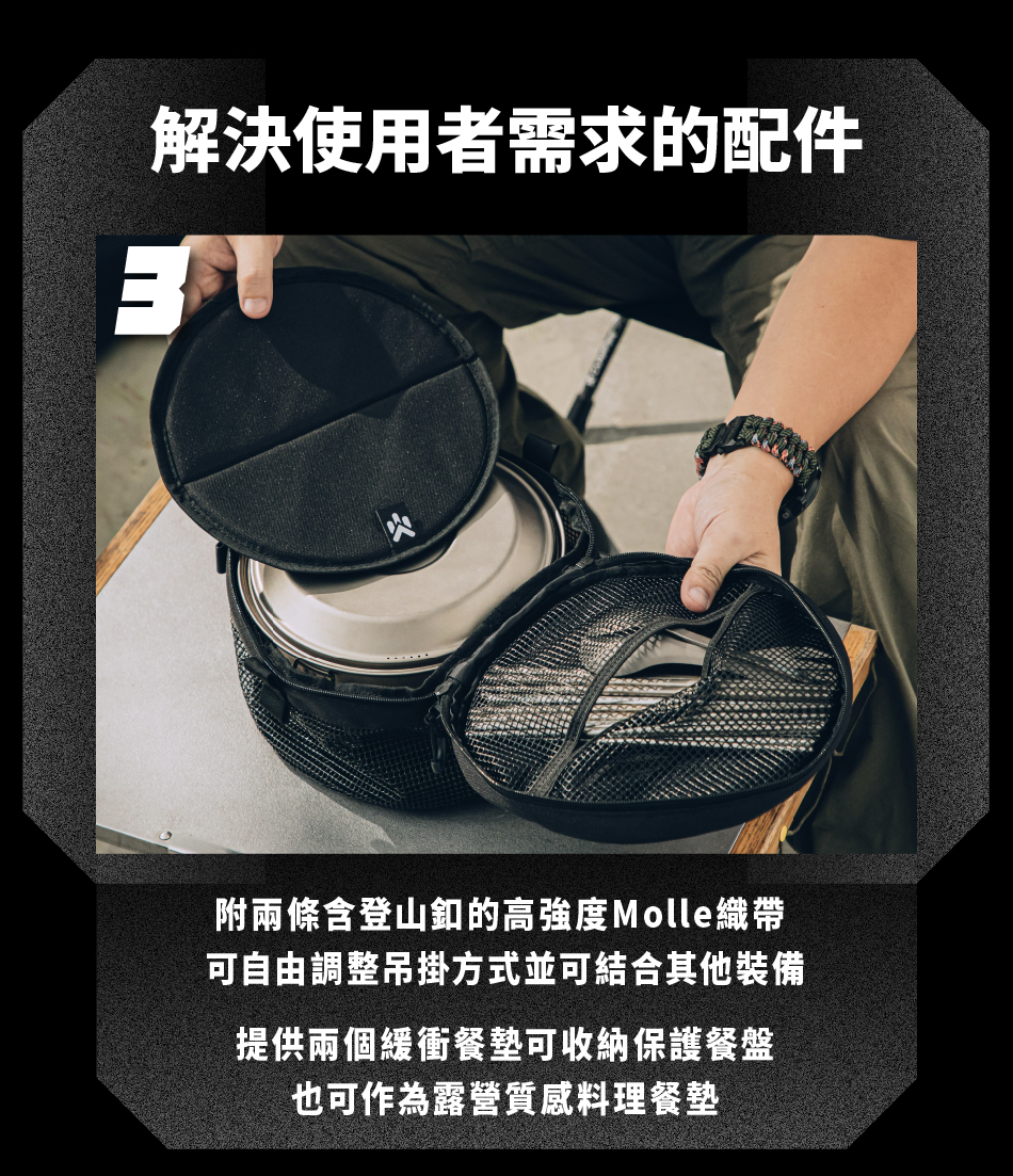 髒污可投入洗衣袋後機洗,配件如Molle織帶與餐