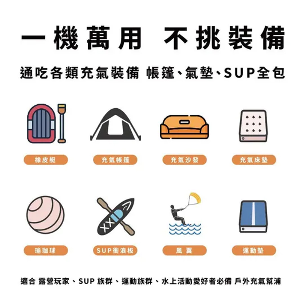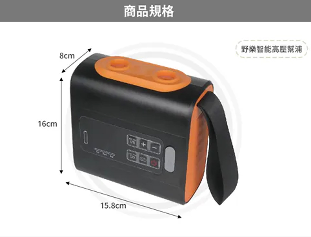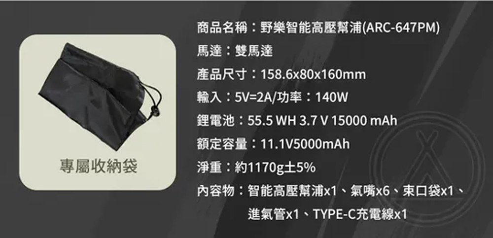 內容物:智能高壓幫浦×1、氣嘴×6、進氣管×1、TYPE-C充電線×1、束口收納袋×1