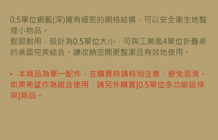 0.5單位網籃(深)擁有細密的網格結構,可以安全衛生地整理小物品。