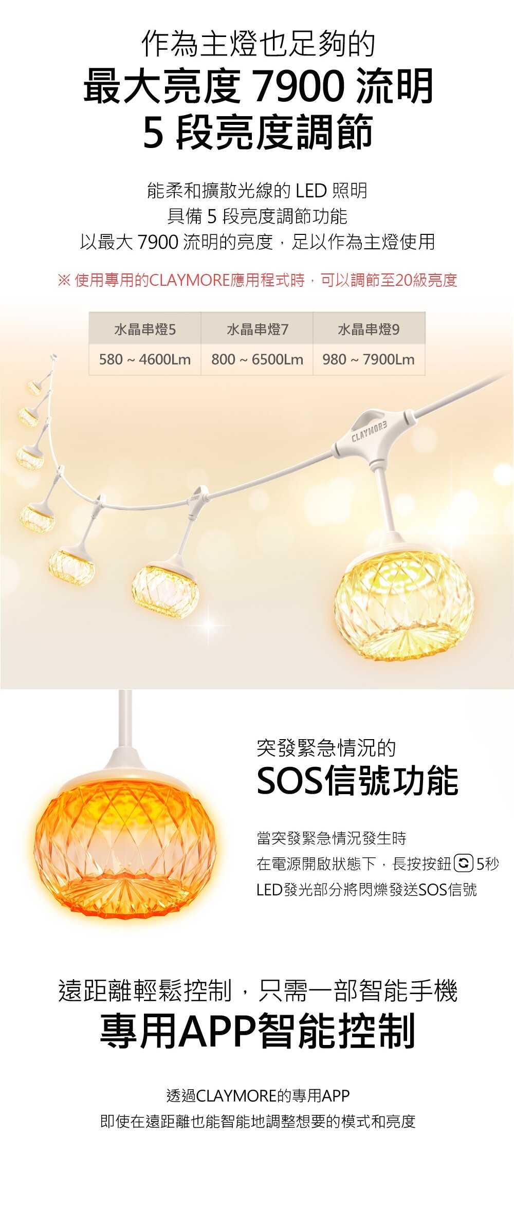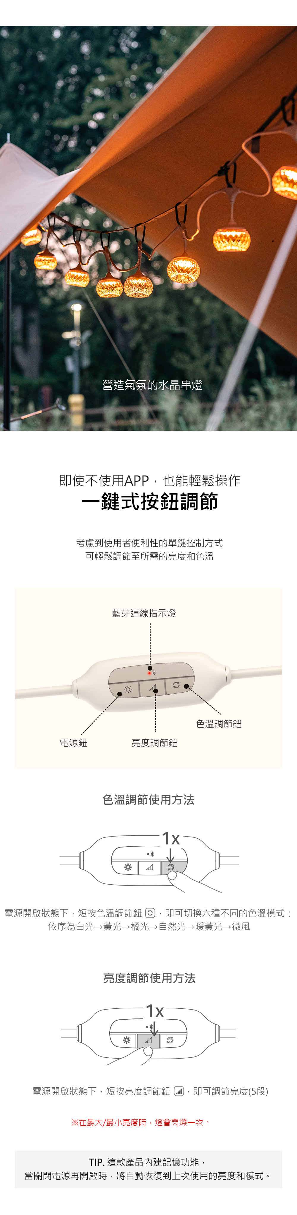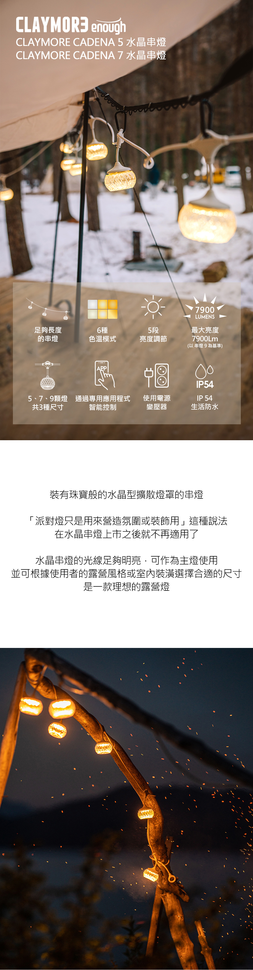 水晶串燈的光線足夠明亮,可作為主燈使用,並可根據使用者的露營風格或室內裝满選擇合適的尺寸,是一款理想的露營燈!