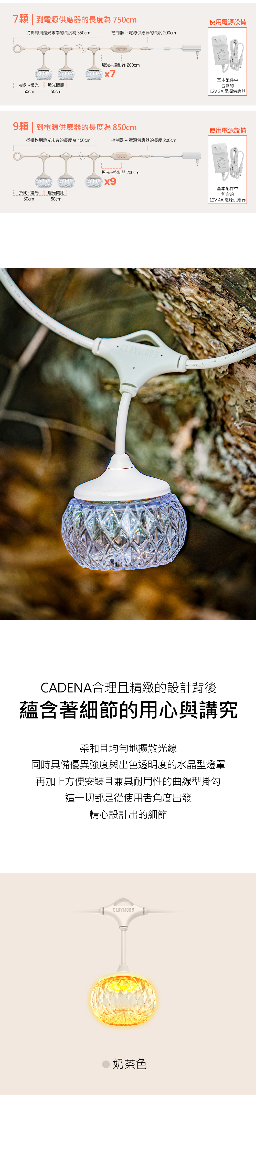 CADENA合理且精緻的設計背後,蘊含著細節的用心與講究,柔和且均勻地擴散光線,同時具備優異強度與出色透明度的水晶型燈罩,再加上方便安裝且兼具耐用性的曲線型掛勾,這一切都是從使用者角度出發,精心設計出的細節。