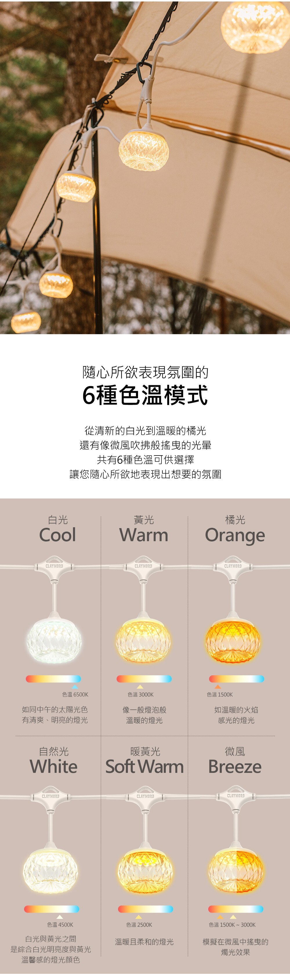 .色溫:橘光:1500K/微風光:1500K~3000K/暖黃光:2500K/ 黃光:4000K/自然光:4500K/白光:6500K