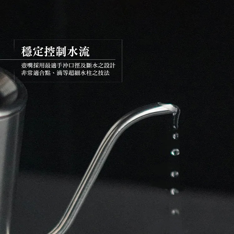 .壺嘴採用最適手沖口徑及斷水之設計,非常適合點、滴等超細水柱之技法