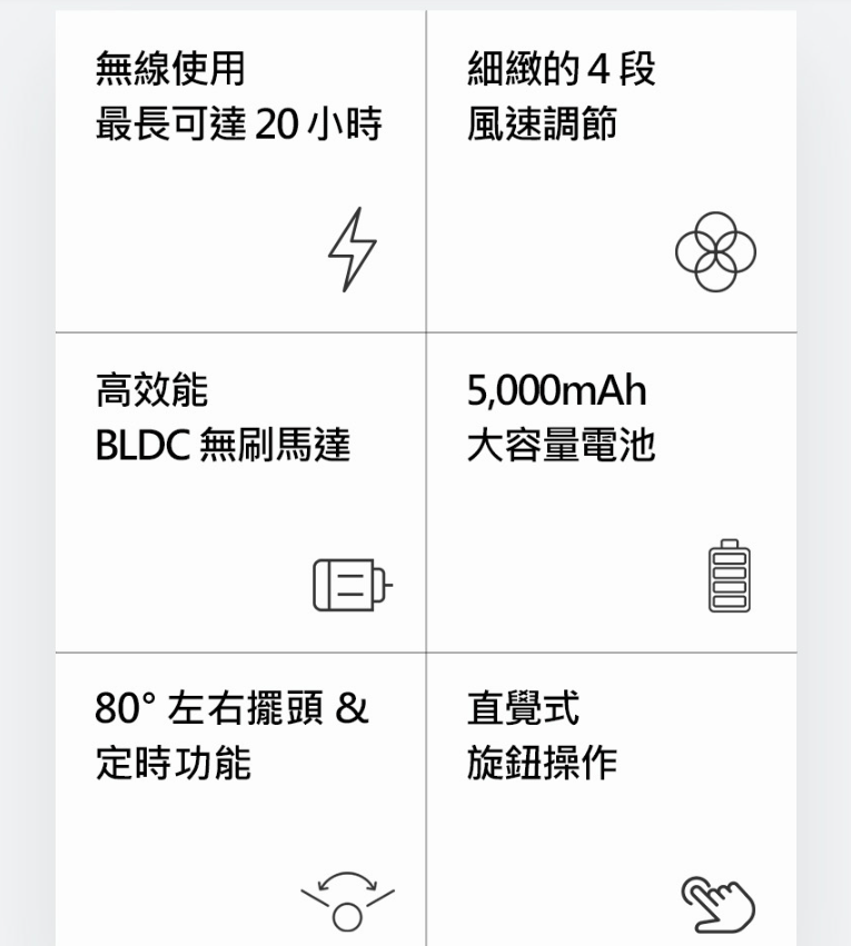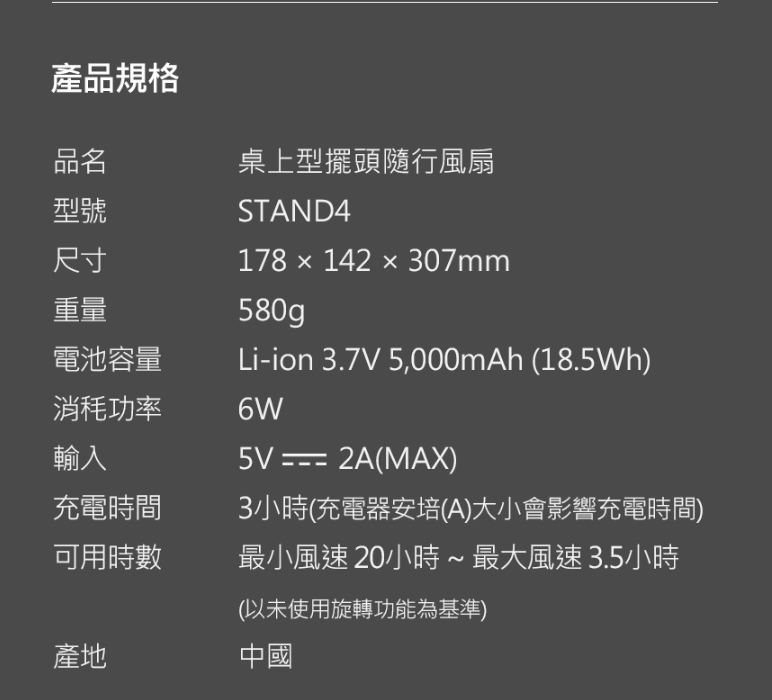 可用時數:最小風速20小時~最大風速3.5小時(以未使用旋轉功能為基準)