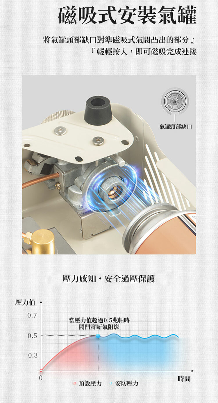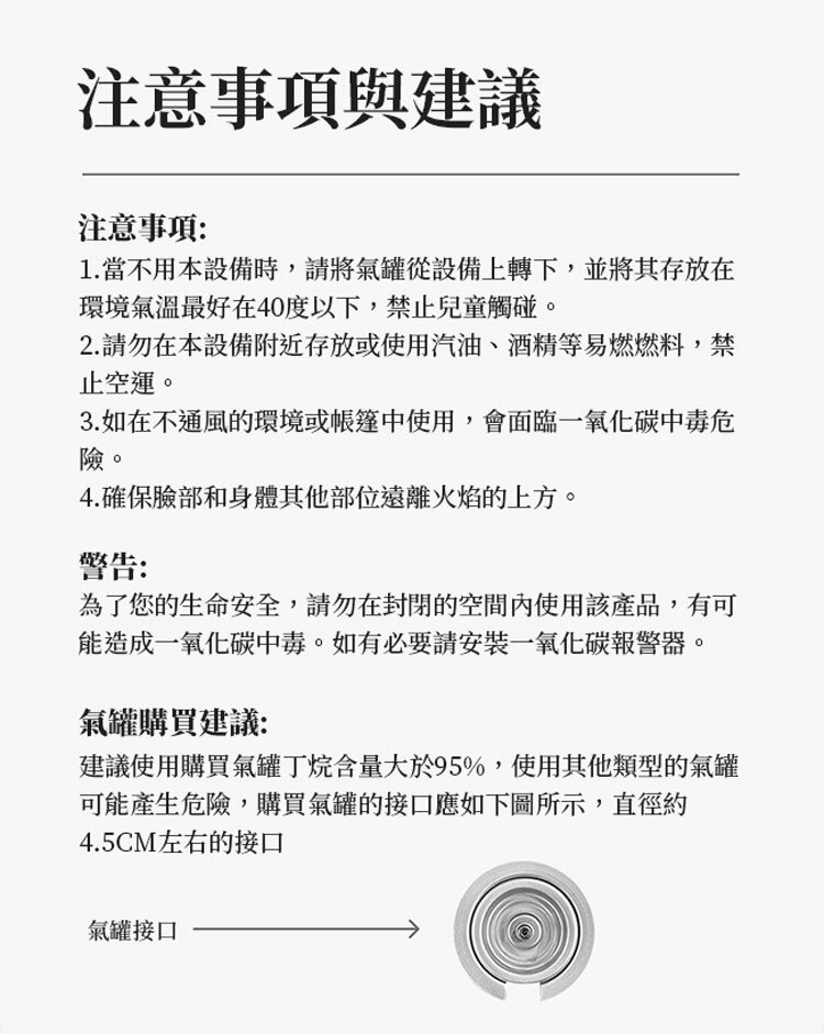 1.不使用本產品時請將瓦斯罐拆下,放置40度氣溫下環境,並避免兒童觸碰。