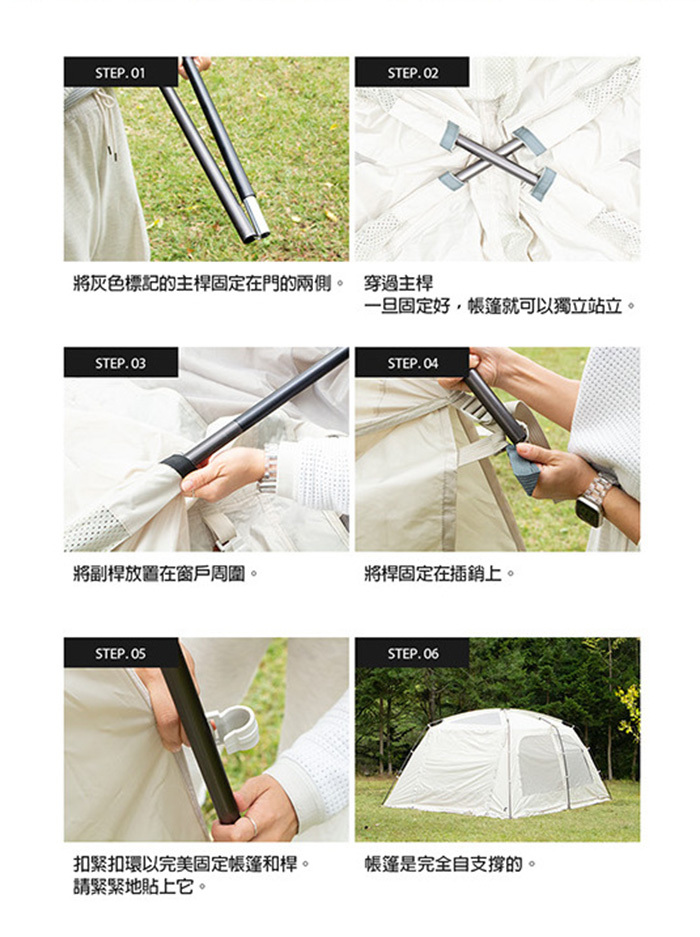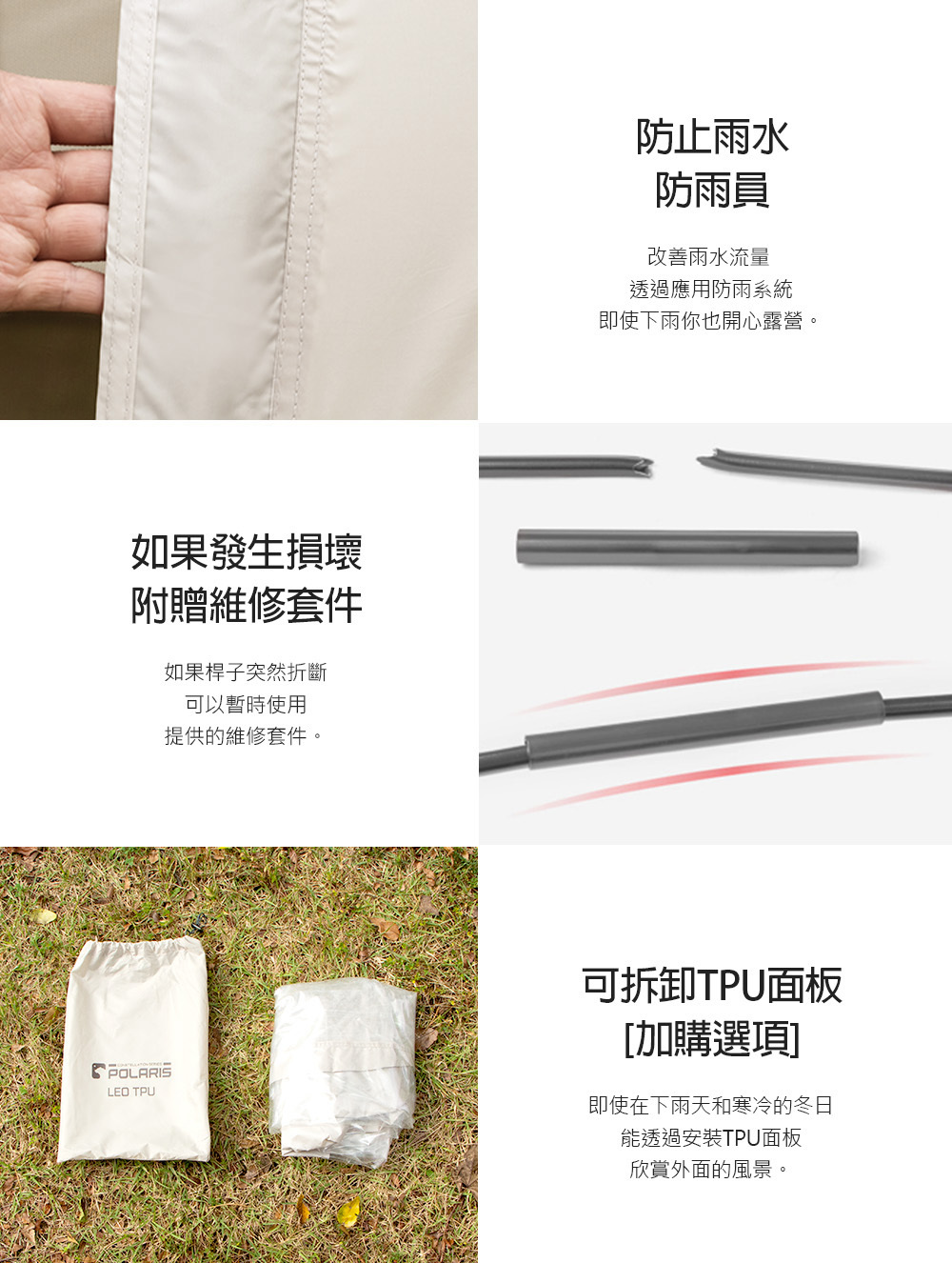 5.強風的環境下,需要注意檢查營柱,風繩。風太大的情況,請及時拆卸並收起帳篷