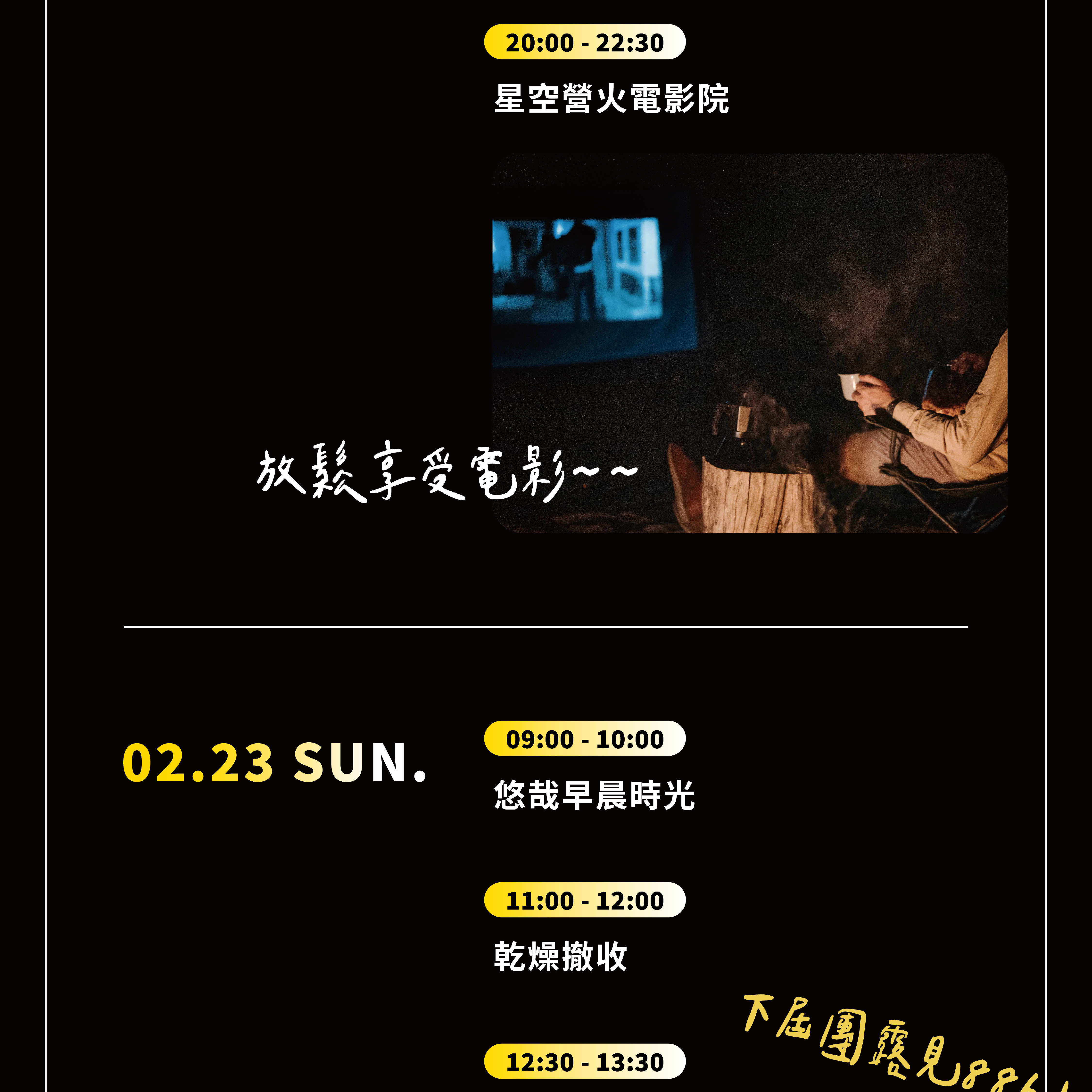 悠哉享受live音樂會沈澱身心靈,提供戶外電影院讓你在星空下圍繞著營火與好友小酌暢談