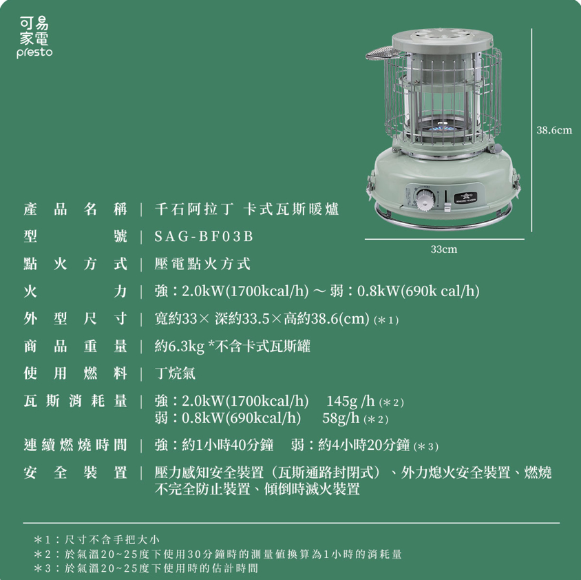 連續燃燒時間:強-約1小時40分鐘、弱-約4小時20分鐘