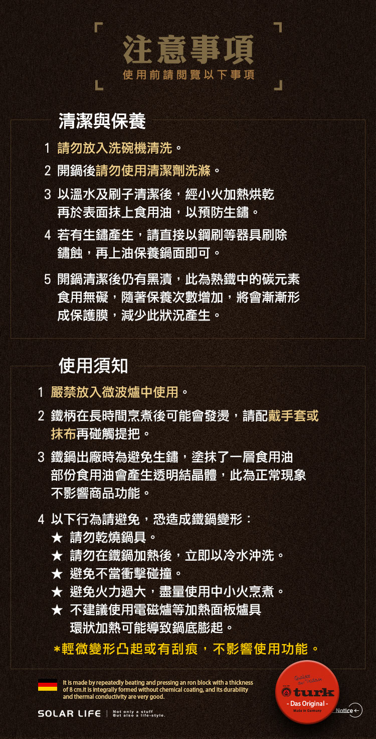 5. 開鍋清潔後仍有黑漬,此為熟鐵中的碳元素,食用無礙,隨著保養次數增加,將會漸漸形成保護膜,減少此狀況產生。